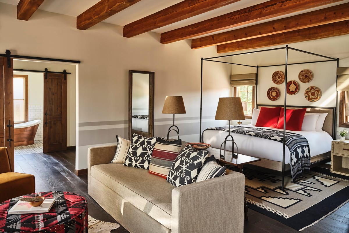 Across the 317 acres, you’ll find just 100 guestrooms, suites and casitas. Whilst the 12-bed Bunkhouse is perfect for multigenerational families looking to connect, our favorites are the Kiva Suites. Sitting in secluded locations, they open up onto a sunrise best viewed from your private plunge pool by the warmth of the outdoor fireplace. All of the rooms are authentically Southwestern in design with exposed beams and rich, earthy textures throughout. There’s also a traditional kiva fireplace with extra warmth brought by bold Navajo patterns.