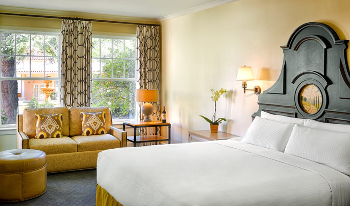 After a sublime day touring the wine country, you can while away evenings on the large cozy sofas and plush armchairs by the fire in your suite. Enjoy a delectable glass of complimentary Sonoma Valley wine whilst taking a soak in your private Jacuzzi surrounded by luxe marble and limestone fixtures. These simple indulgences make for a quaint yet utterly luxurious stay.