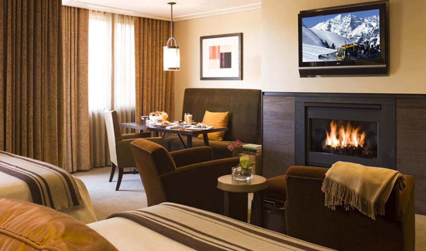 The Little Nell boasts fresh and contemporary yet cozy and definitively alpine decor, with breathtaking views of Aspen Mountain and charming downtown Aspen. With a palette of muted tones including maple wood and soft cream bed linens, the rooms are a haven for rest and relaxation. All bedrooms include a stone-clad gas-log fireplace, flat screen LCD television, Blu-Ray DVD player, sound system with iPod docking station, high-speed Wi-Fi access and five-point baths adorned with His-and-Her Caesar stone vanities, Crème de Marfil heated marble flooring and walls and exclusive all natural “First Tracks” June Jacobs spa amenities.