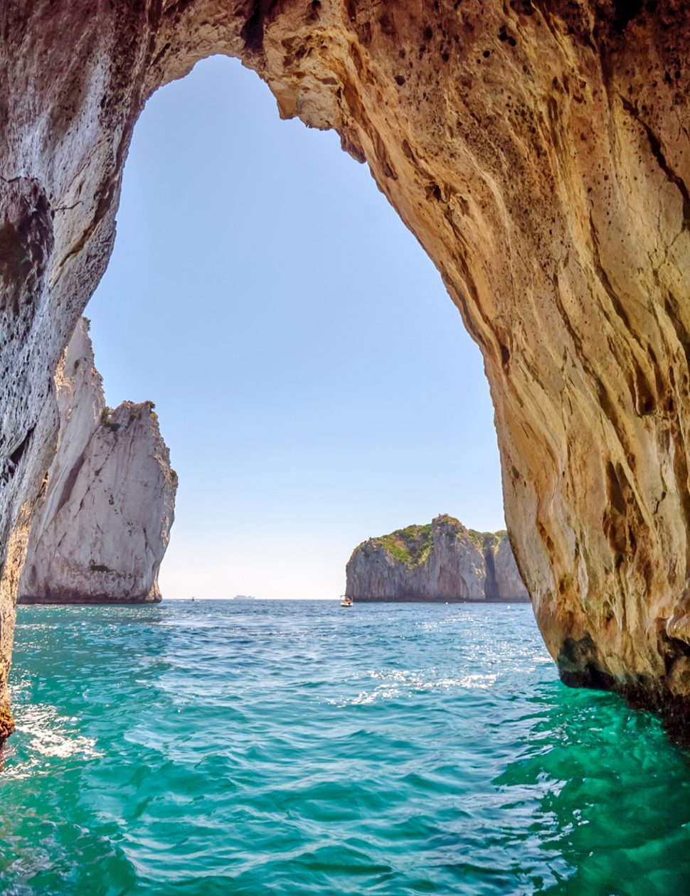 High up on our list of the top things to do in Capri is a private excursion around the island and into the Blue Grotto, where sunlight passing through the cave creates a stunning blue reflection and illuminates the cavern. Aboard a stylish gozzo boat, your skipper will pick you up from Capri port and paddle you through the cave’s small opening, heading towards the glowing sea. Sitting directly above an underwater crevice, the Blue Grotto’s water is illuminated by a beam of sunlight entering through the crack, creating a magical feel whilst exploring the cave.