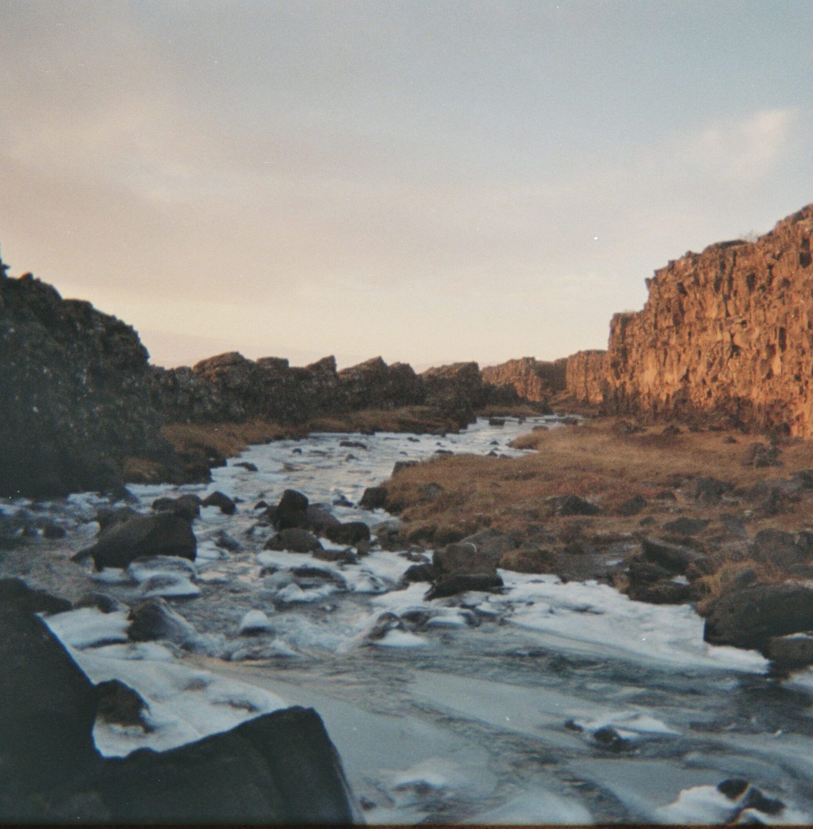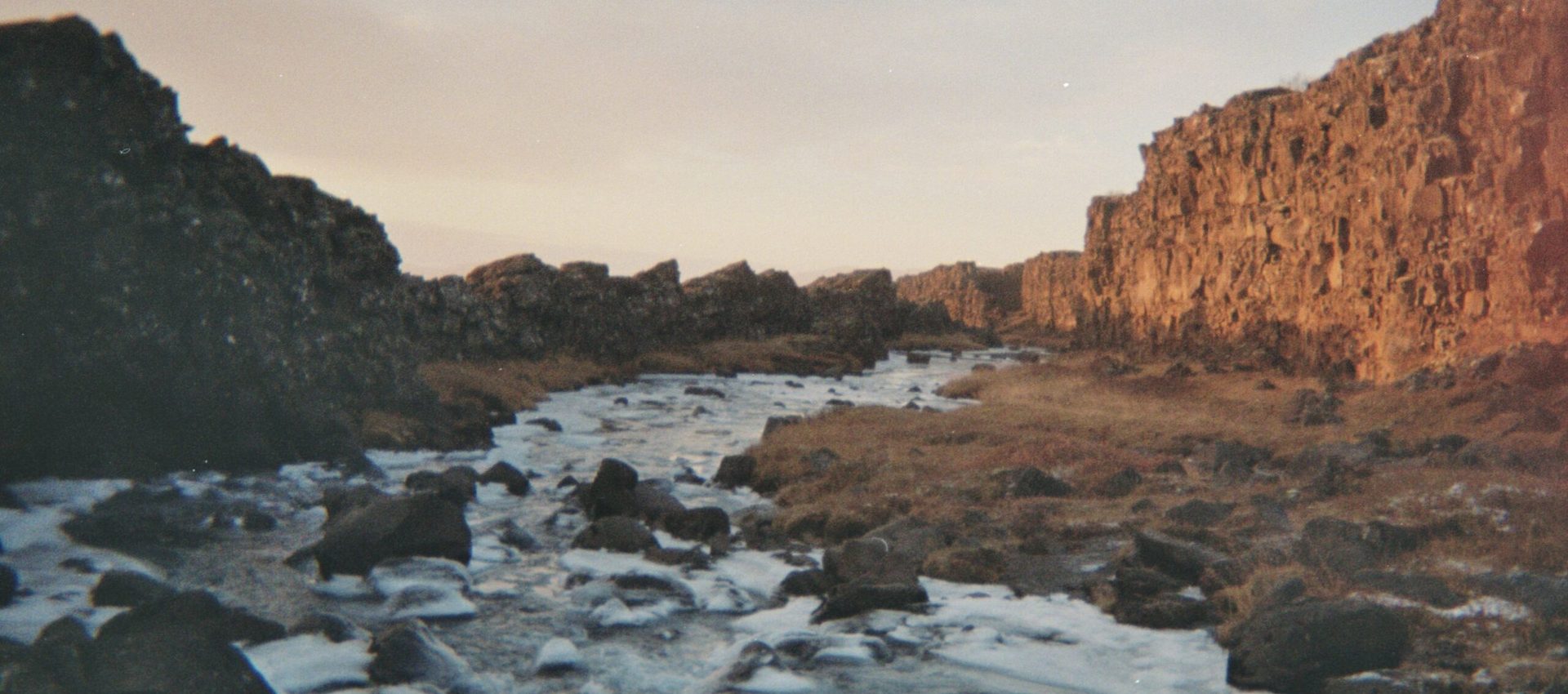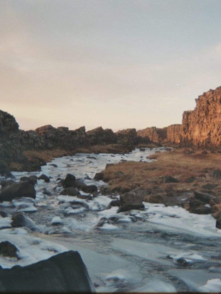 As we walked along the wooden walkway that led between the two towering continental crusts, we saw long tufts of yellow-brown grass peeking out from between the dark boulders that made up the rugged landscape. Our boots crunching on a light dusting of show, we arrived at Oxararfoss, the waterfall that flows directly down Iceland’s tectonic plates themselves. The water gushed over a white canvas of icicles and compact clumps of snow – all glinting in the sunlight, making them look amber and gold. The river, partially filled with rocks (some trapped in ice, others covered in snow), was a pale greyish blue, and contrasted beautifully with the bright yellows of the higher rocks that the sun had managed to reach. After all, it was still early. But not too early for ice cream.