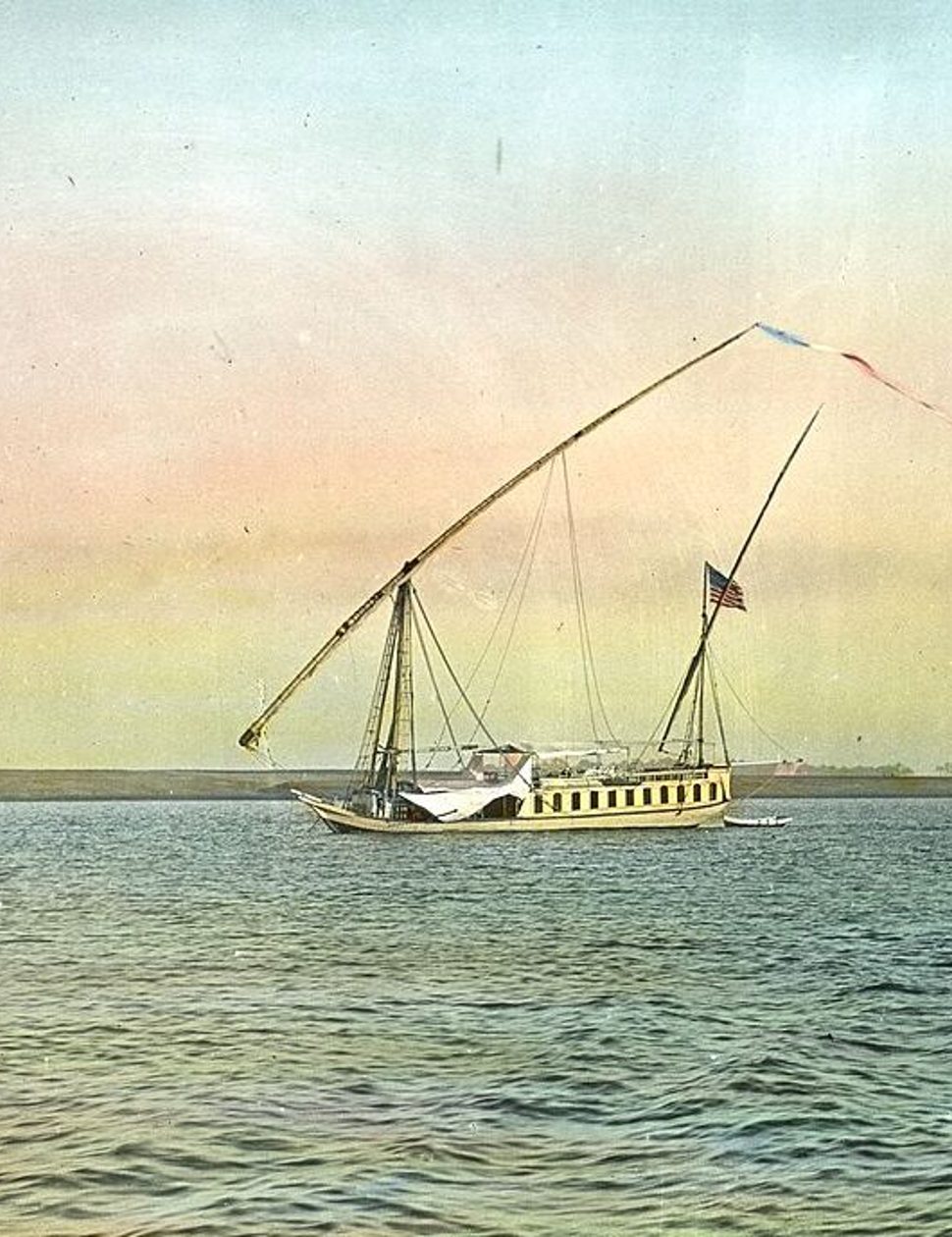 By the late 1850s, the Dahabiya was the vehicle of choice for most travelers who came to Egypt. These distinctive vessels were based on traditional barge-like houseboats slung across with delicate cross-sails that had been in use for centuries. “Resembling the painted galleys represented on the tombs of the Pharaohs,” these vessels — as the 1911 edition of the Encyclopedia Britannica notes — were also used by the later kings and rulers of Egypt, their decks and sails “ornamented by gilding.” This is what lends the boat its name; ‘dahab’ meaning gold.